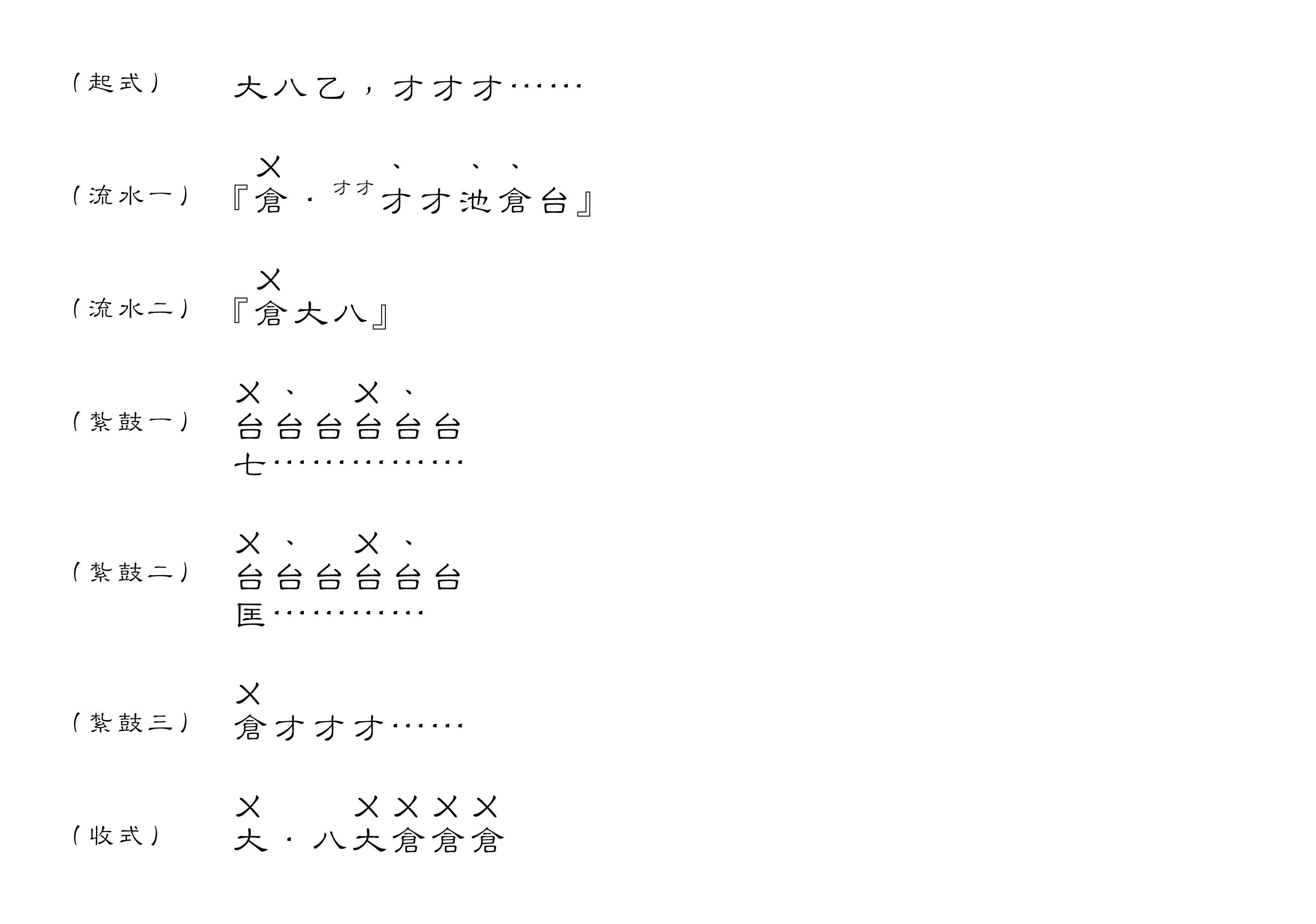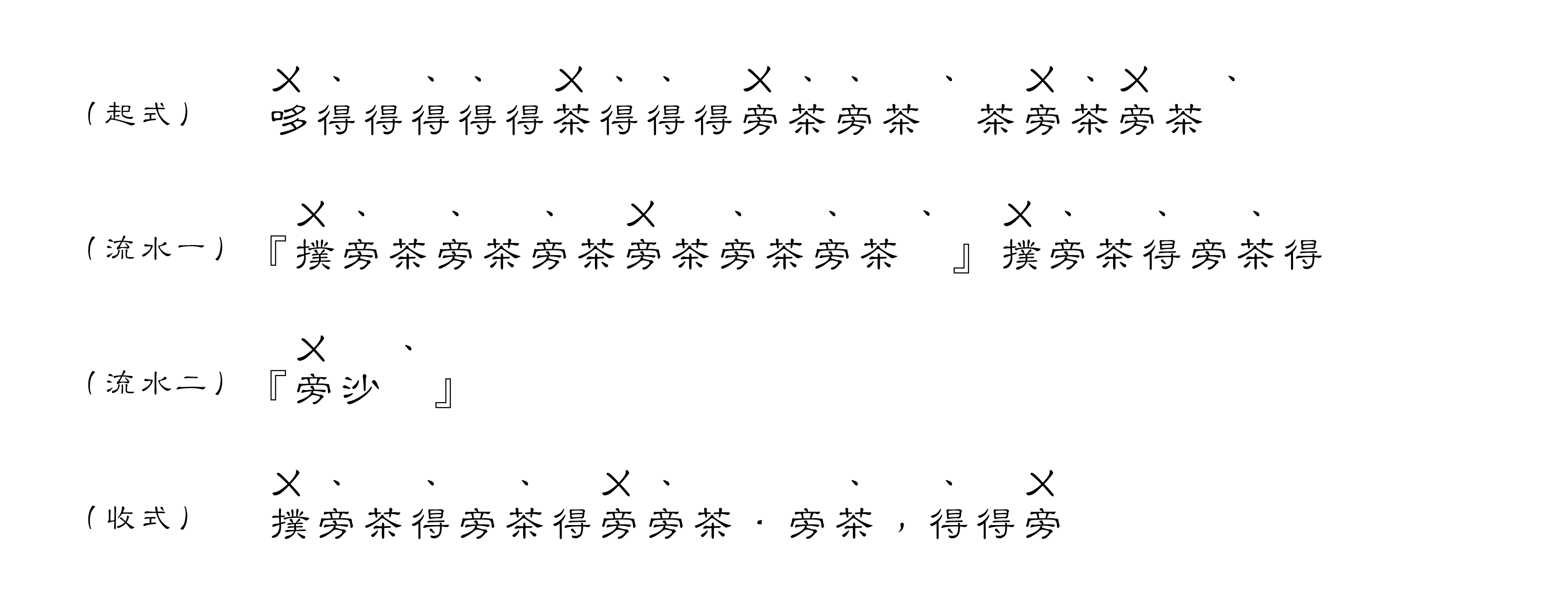 循環1 – 紮鼓3 – 循環2 – 紮鼓1 – 循環1 – 紮鼓1 – 收式