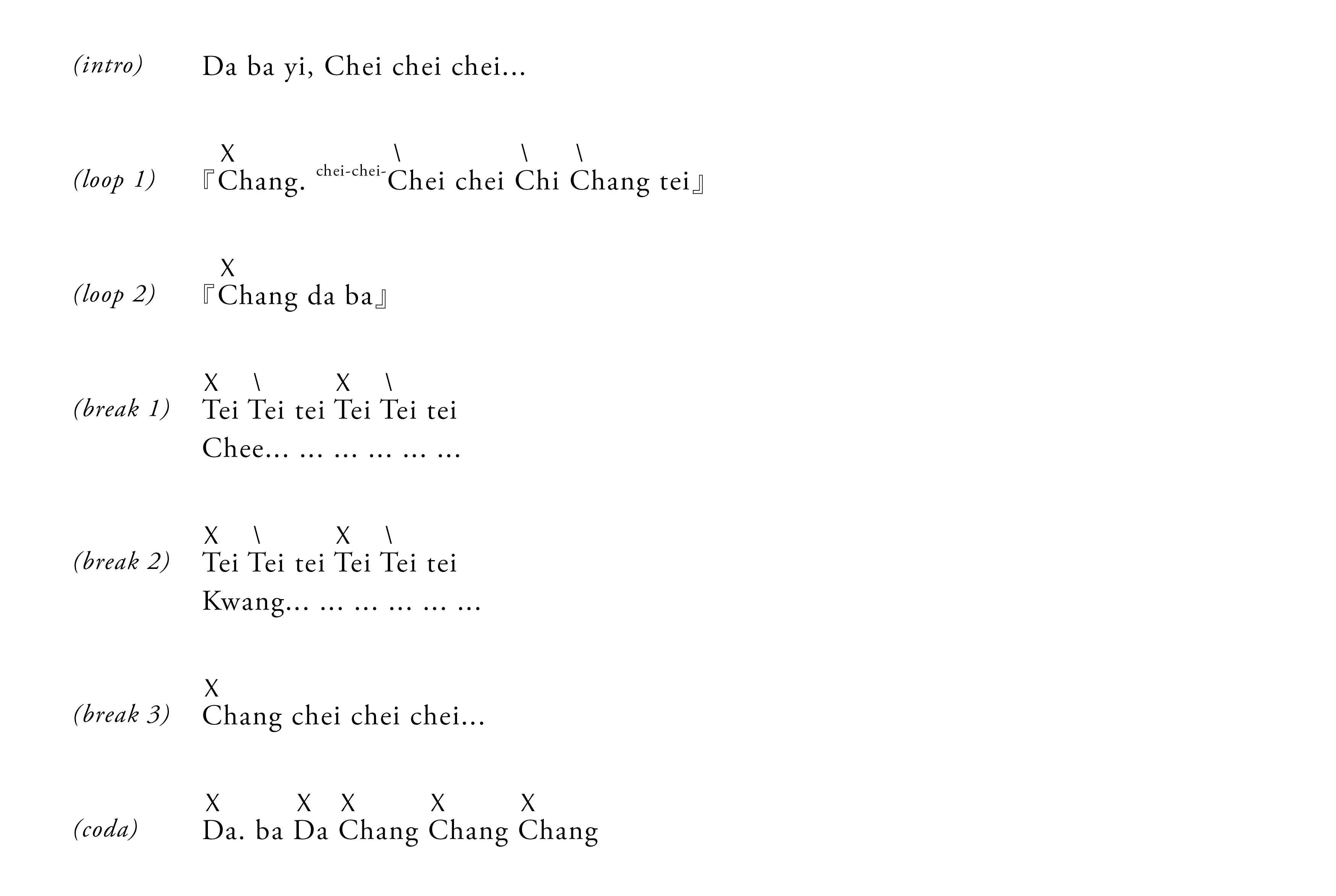起式 – 循環1 – 循環2 – 循環 1 – 紮鼓 1 – 循環1 – 循環2 – 循環 1 – 紮鼓 2 – 循環 1 – 紮鼓 3 – 收式
