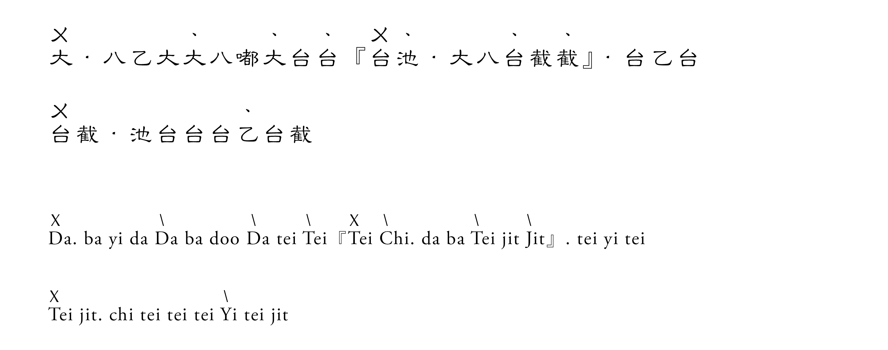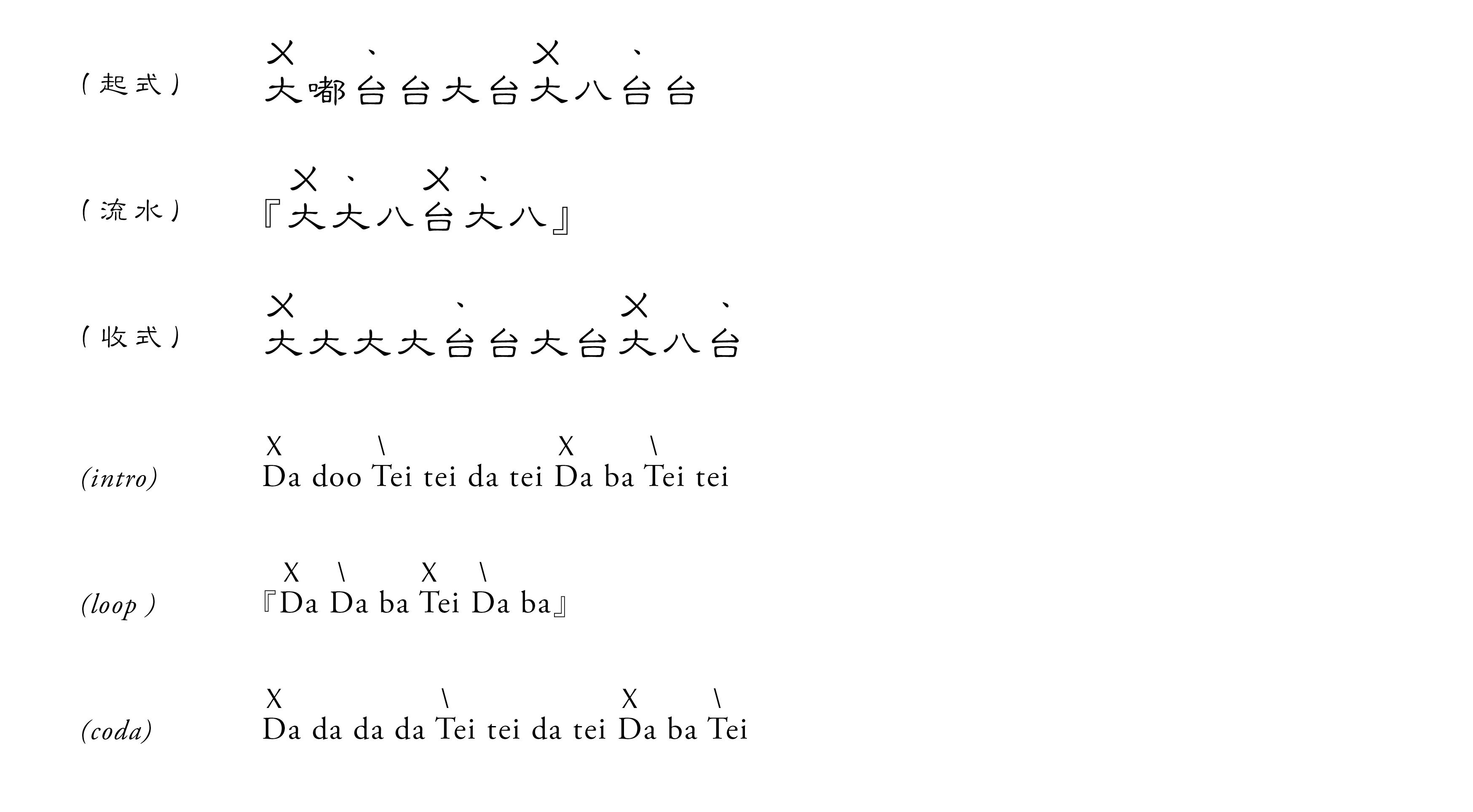 起式 – 循環1 – 紮鼓1 – 循環1 – 紮鼓2 – 循環2 – 循環3 – 循環4 – 循環5 – 紮鼓2 – 循環2 – 循環5 – 收式