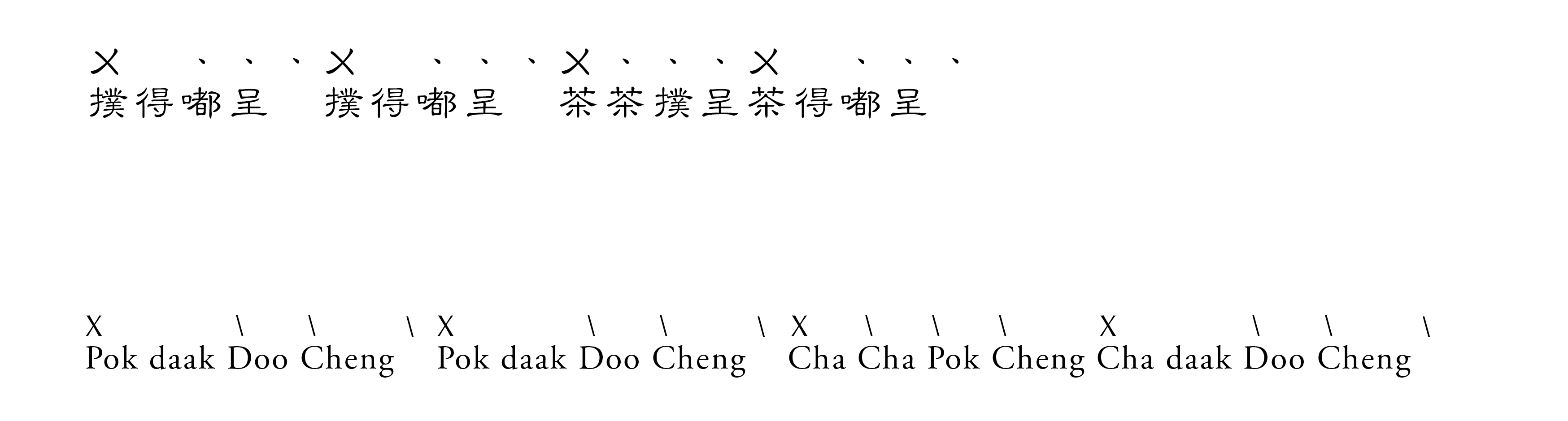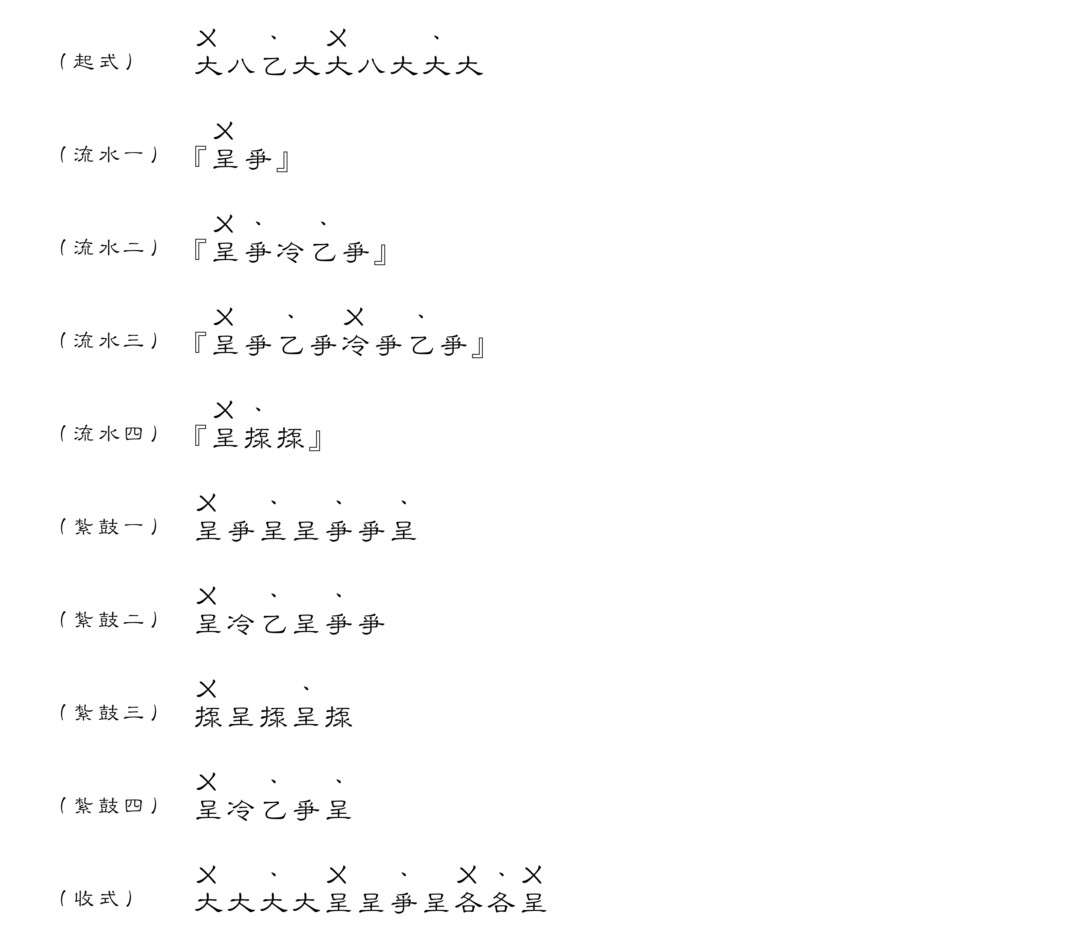 起式 – 循環1 – 紮鼓1 – 循環2 – 循環1 – 紮鼓2 – 循環3 – 紮鼓3 – 循環1 – 循環4 – 紮鼓4 – 循環1 – 收式