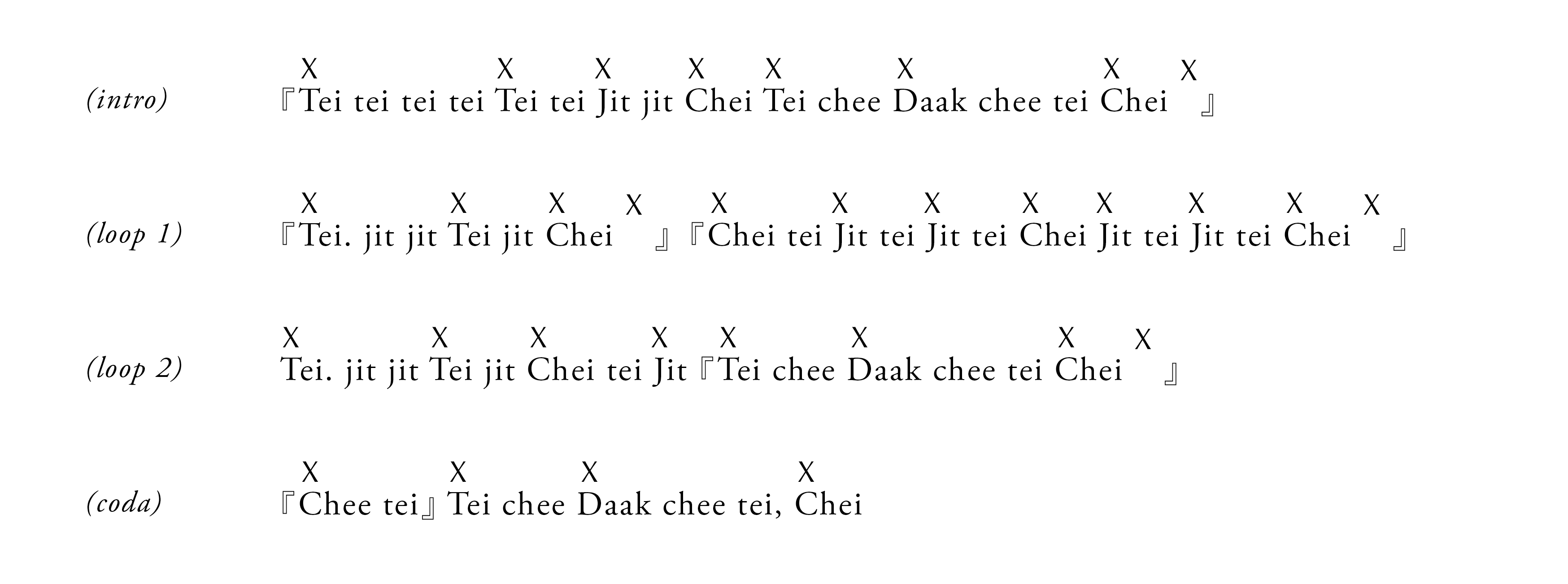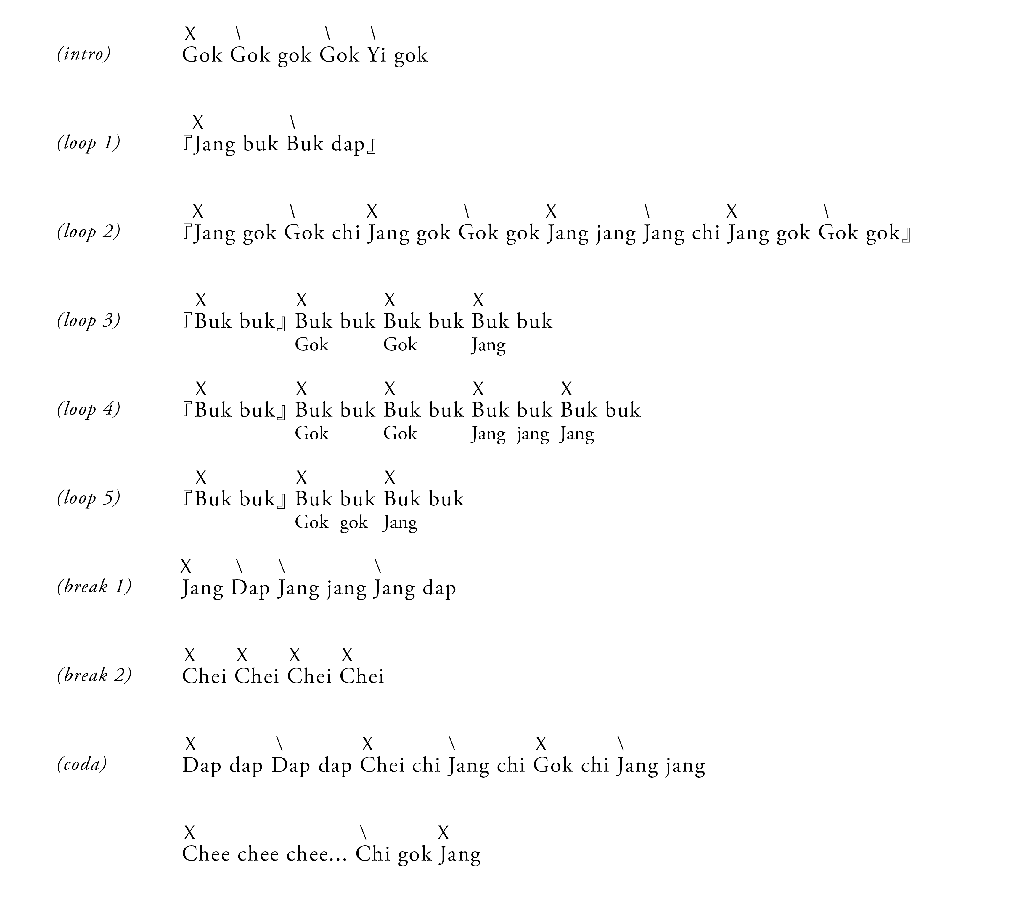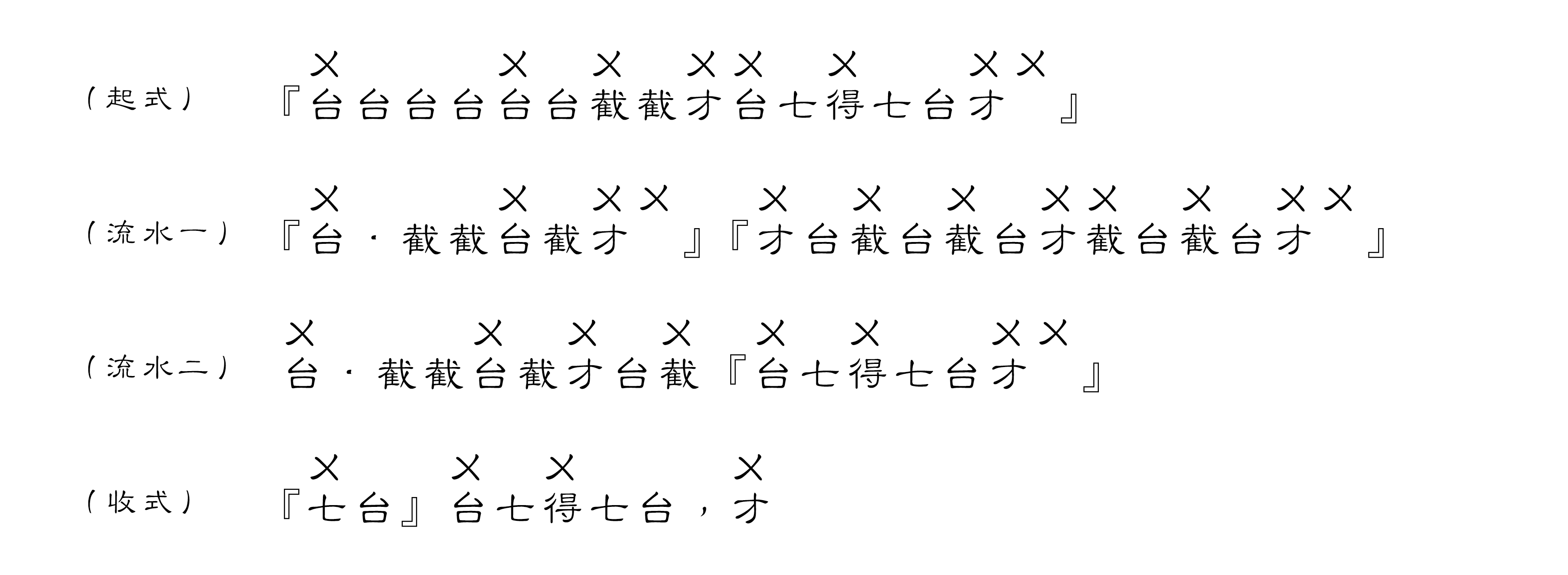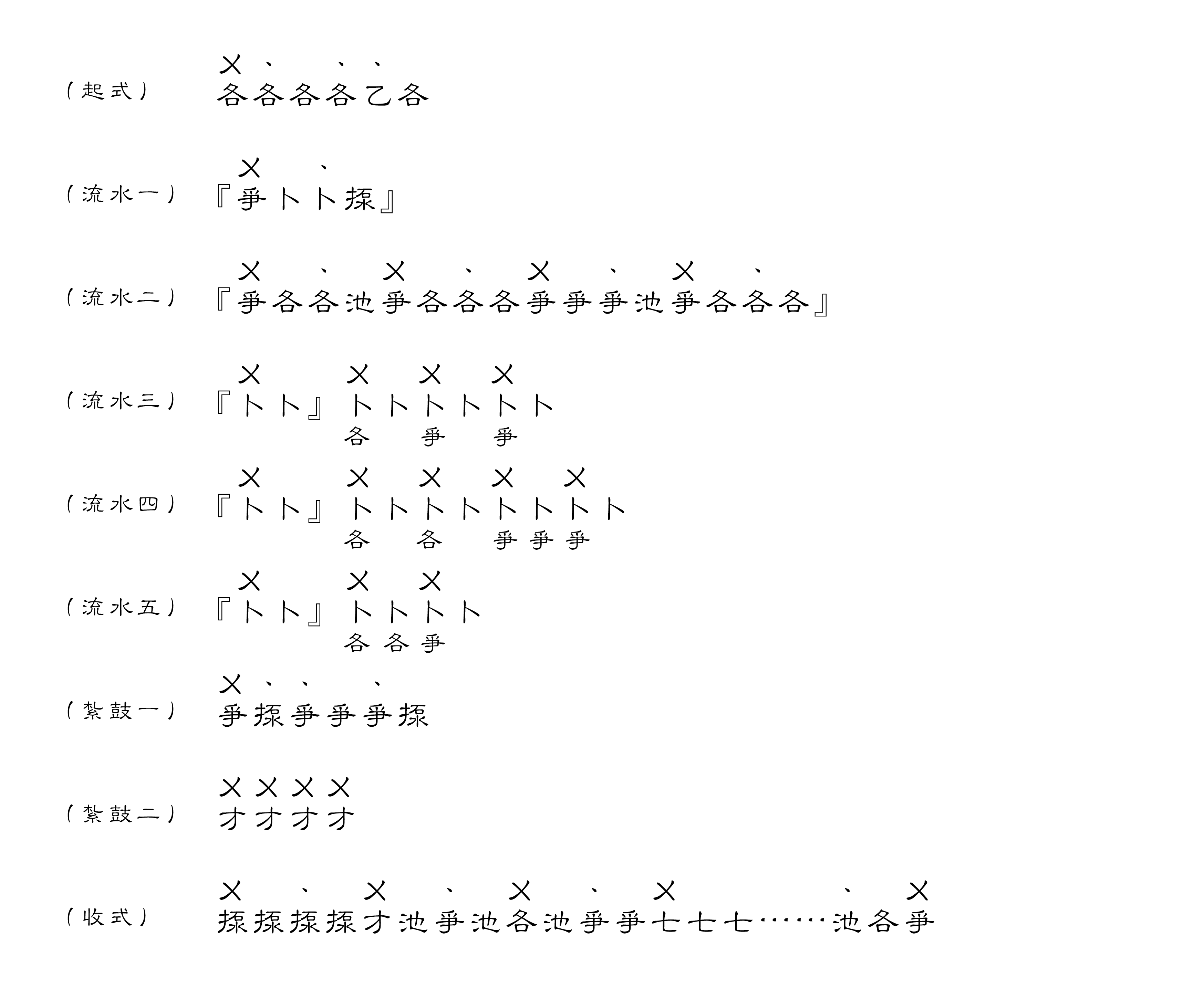 起式 – 循環1 – 紮鼓1 – 循環1 – 紮鼓2 – 循環2 – 循環3 – 循環4 – 循環5 – 紮鼓2 – 循環2 – 循環5 – 收式